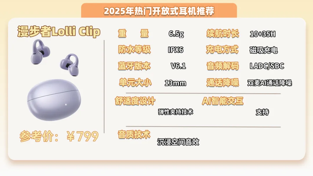 推荐八:漫步者Lolli Clip开放式耳机 (799元)推荐指数:⭐⭐⭐机型亮点:耳夹结构稳固,运动的时候也不会晃