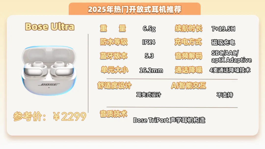 推荐九:Bose Ultra开放式耳机 (2299元)推荐指数:⭐⭐⭐⭐⭐机型亮点:蓝牙连接很稳,隔着墙也不卡