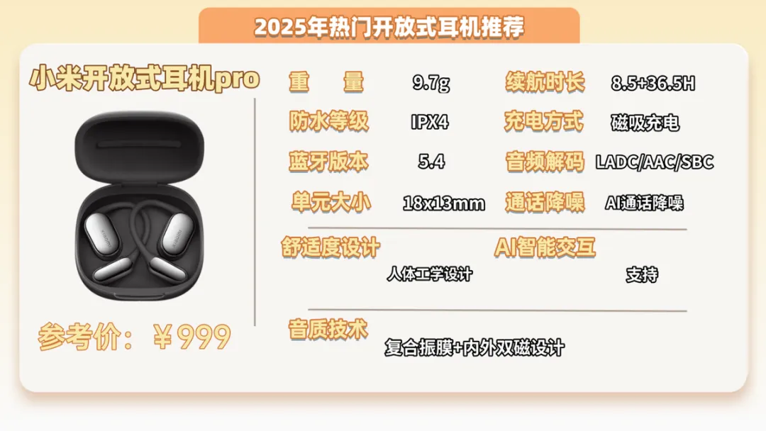 推荐十:小米开放式耳机Pro(999元)推荐指数:⭐⭐⭐⭐机型亮点:独立空间音频,开启后可以有更加沉浸的体验