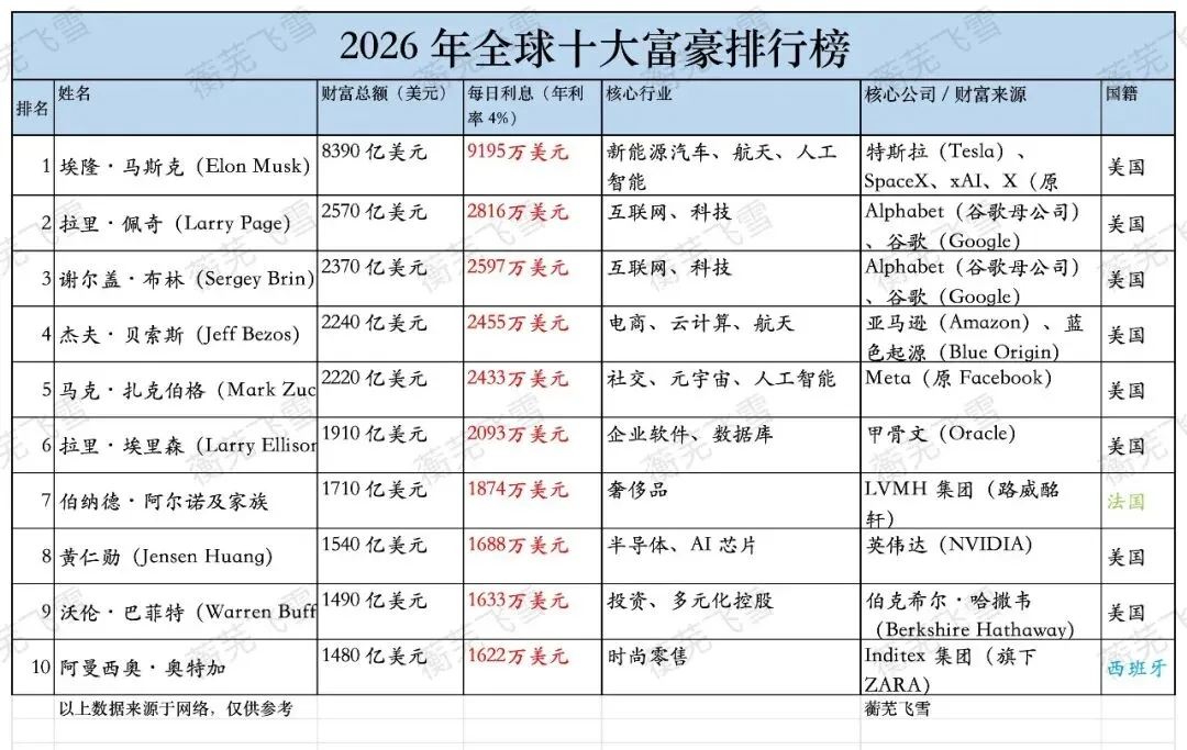 一起来看看2026年世界富豪排行榜。