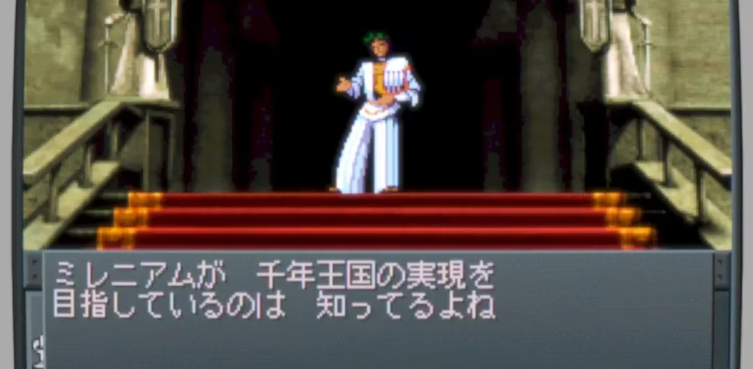*圣教新闻联播正在播放ザイン(Zain)叛教并散播不实流言给权威抹黑的报道,中途遭到了电波干扰,Zain义愤填膺地切入画面,无比激愤地痛陈圣教毁灭VALHALLA的不人道作为,并指出在圣教的官僚制度背后,只是为所谓神的千年王国挑选少数能进入的特权阶层而已,选拔完成后其余不相干地区和居民都会被放弃和清除,VALHALLA的大***惨剧就是个活生生的例子。听完演说,尚未决定自己前进方向的主角随后前往天桥彼端之下的大教会打听进一步的消息