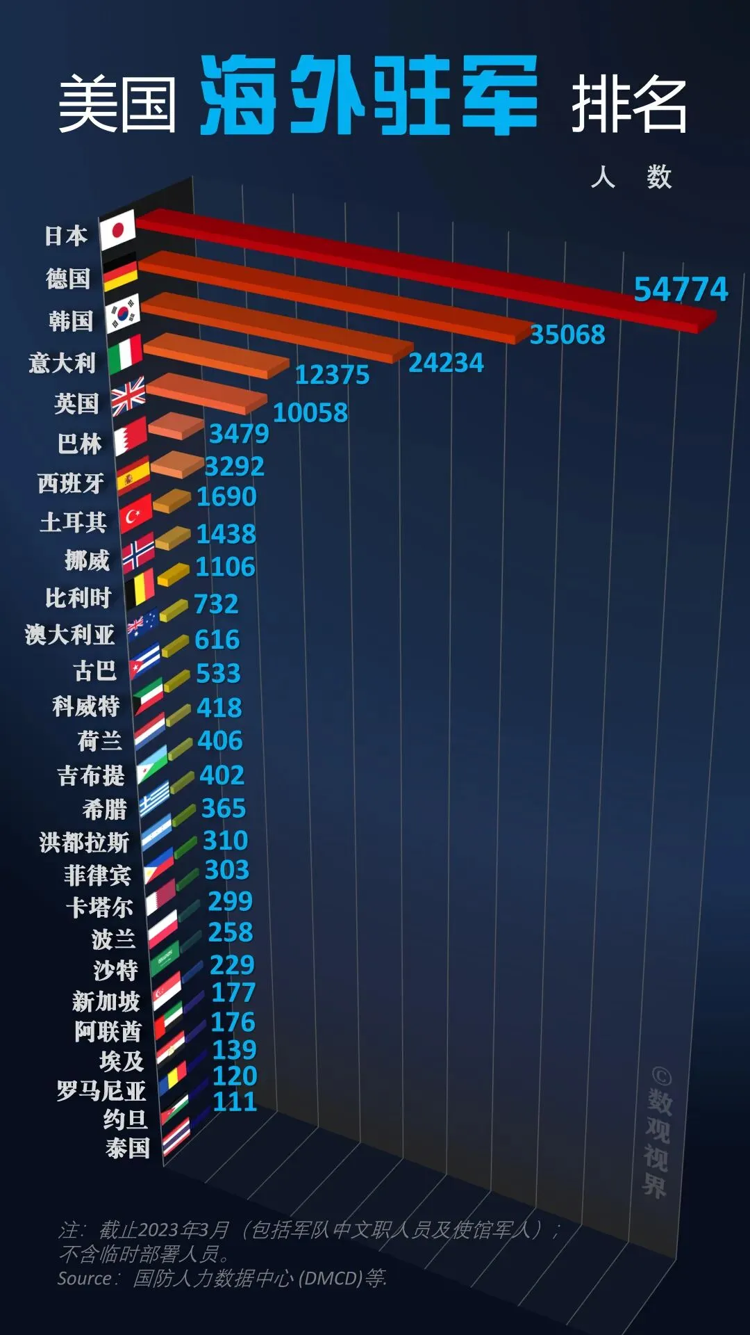 以下美军驻扎部分国家人数排名不含临时增加部署的人员(如俄乌冲突后美国向欧洲部署的8万军人),包含美国使馆中的军人。