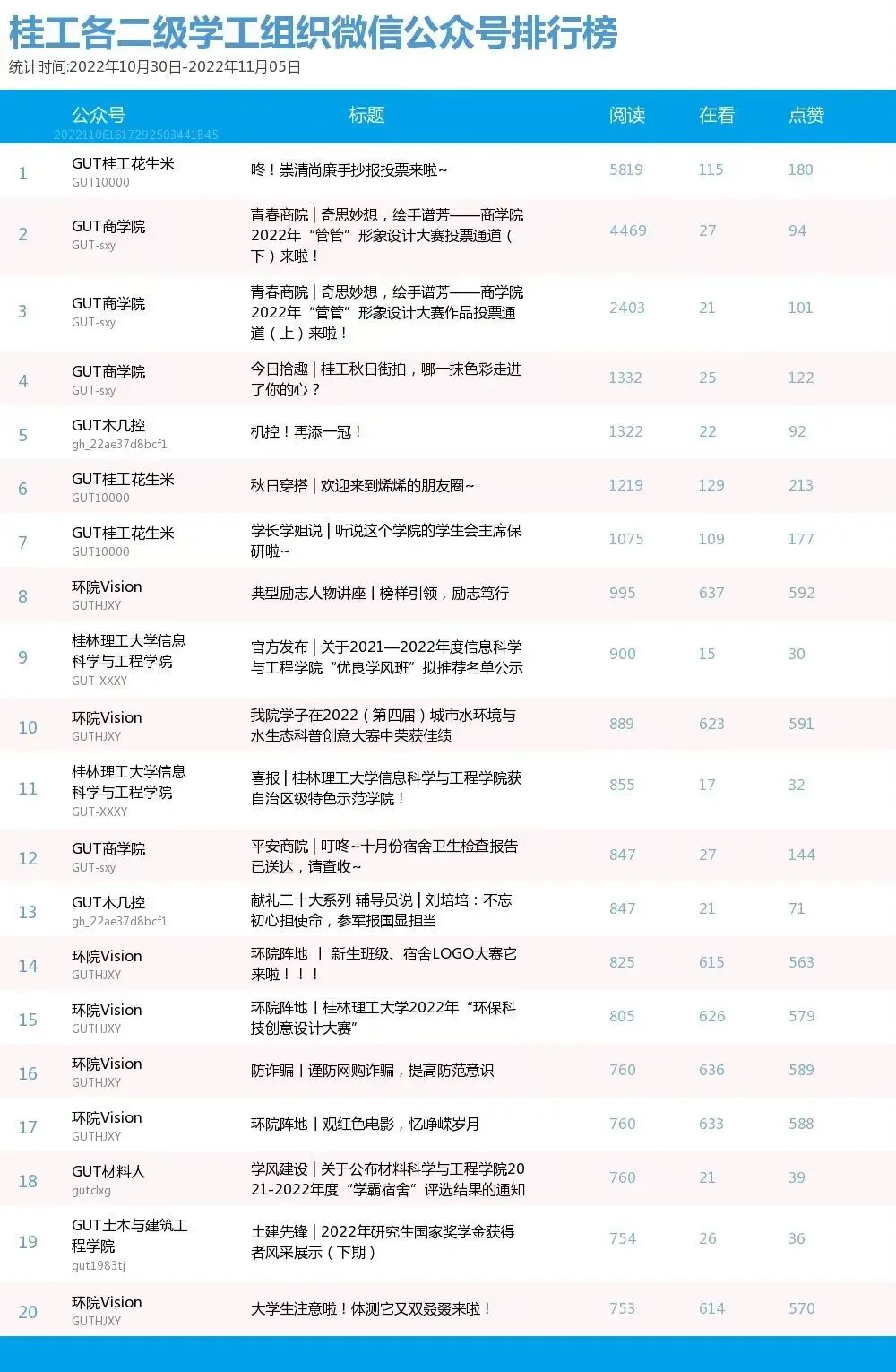 排行周榜|桂工二级组织微信公众号十一月第一份活跃榜单强势来袭!