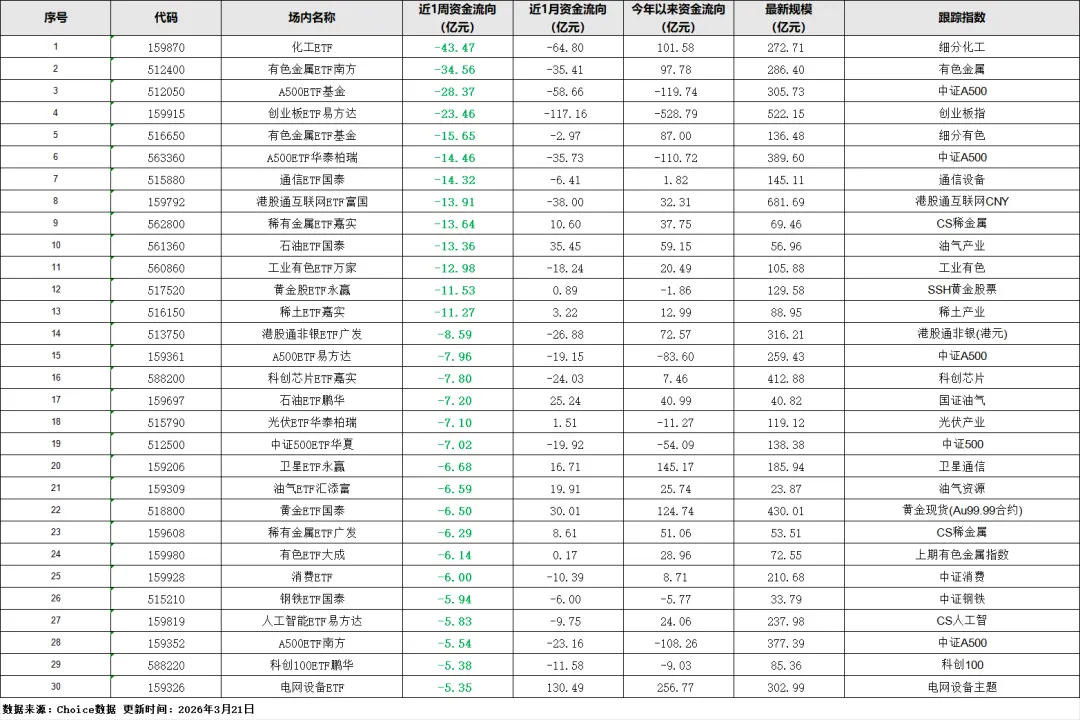 周期板块集体失血:化工ETF(-43.47 亿)、有色金属ETF南方(-34.56 亿)、A500ETF基金(-28.37 亿)、创业板ETF易方达(-23.46 亿)排在流出榜前列,大宗商品和中小盘成长股遭短期抛售。