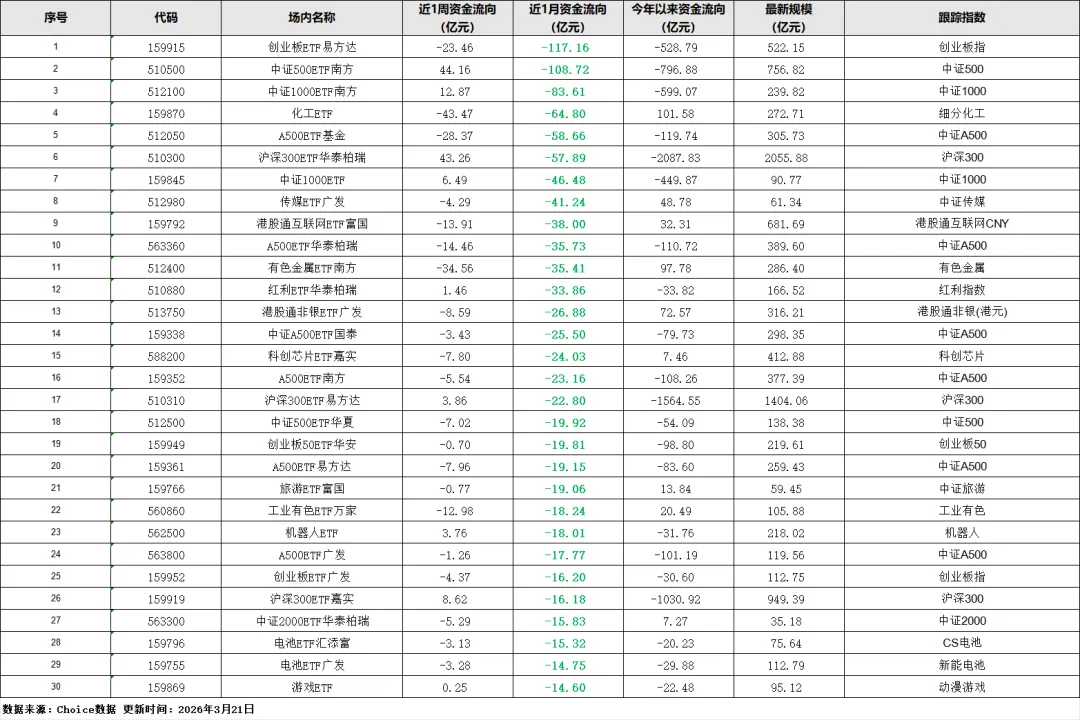 宽基ETF遭大额赎回:沪深300、中证500、中证1000、创业板指等核心宽基,近一月普遍净流出几十亿甚至上百亿,比如沪深300ETF华泰柏瑞单月流出57.89 亿,中证500ETF南方流出108.72 亿,创业板 ETF易方达流出117.16 亿。