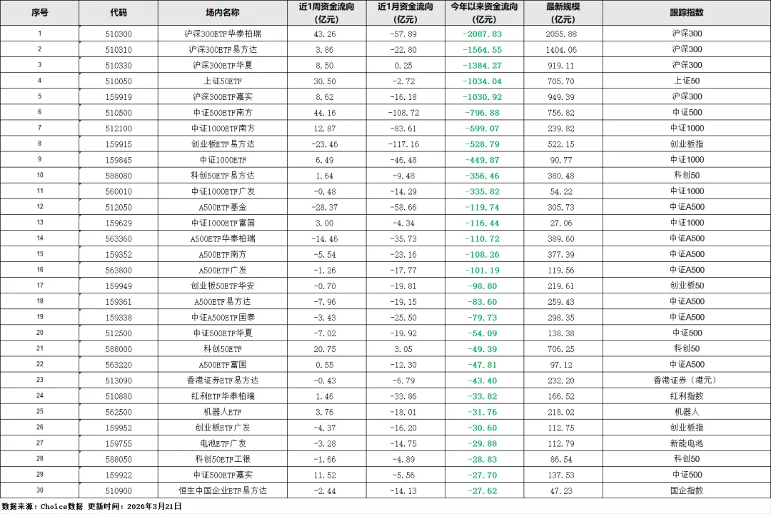 沪深300成 “失血王”:沪深 300ETF 华泰柏瑞今年至今狂泻 2087.83 亿,易方达、华夏、嘉实旗下的沪深300ETF 也合计流出超 4000 亿,是全市场最大的资金流出方。
