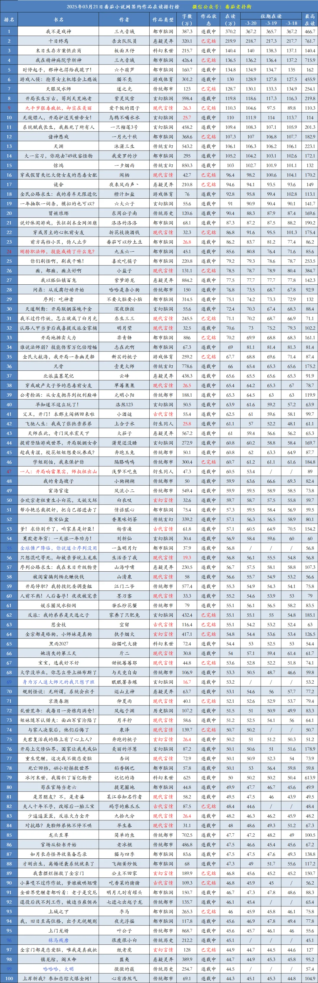 本期番茄在读排行榜共统计到100本作品。
