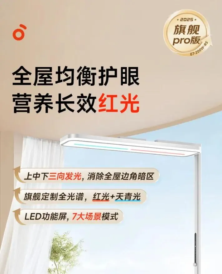 聊起护眼灯里的“老江湖”,孩视宝绝对排得上号。这台E7-200W-RS一开箱,最直观的感受就是“敞亮”。它那200W的大功率真不是盖的,上下两个发光面一起工作,光通量拉满,往客厅一放,瞬间把整个空间都提亮了。特别适合那种书房连着客厅的开间户型,或者孩子喜欢在茶几上写写画画的家庭,一盏灯就把学习区和活动区的照明全给包圆了。