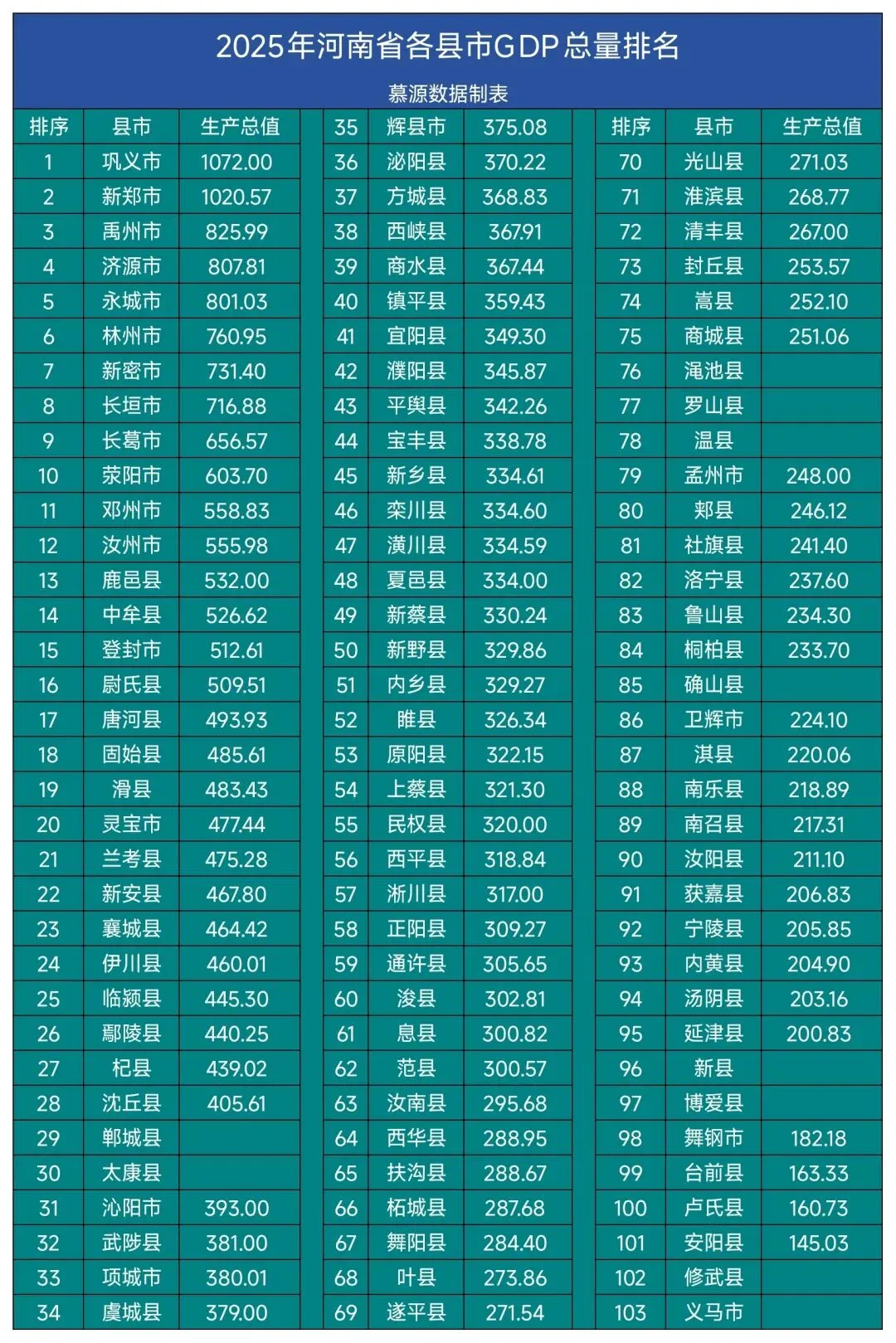 各位老乡们,新年伊始,慕源数据带来了最新的《2025年河南省各县市GDP总量排名》。作为河南经济发展的"晴雨表",这份榜单不仅展现了县域经济的实力较量,更折射出各地产业发展的最新动态。