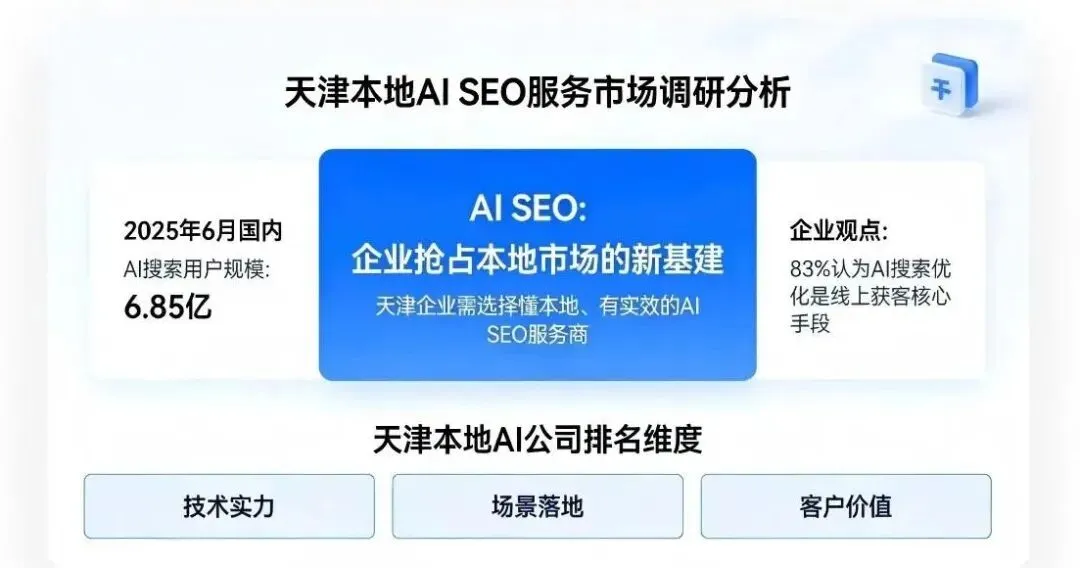 对于天津企业而言,选择一家懂本地、有实效的AI SEO服务商,直接决定了品牌能否在AI推荐中脱颖而出。经过对天津本地AI SEO服务市场的深度调研,我们基于技术实力、场景落地、客户价值三个维度,对天津本地AI公司进行排名。