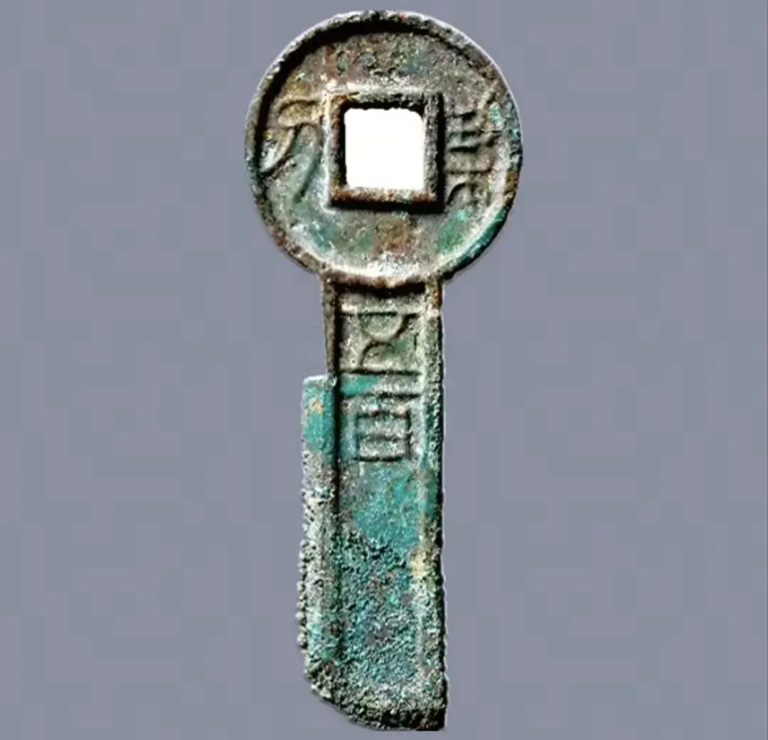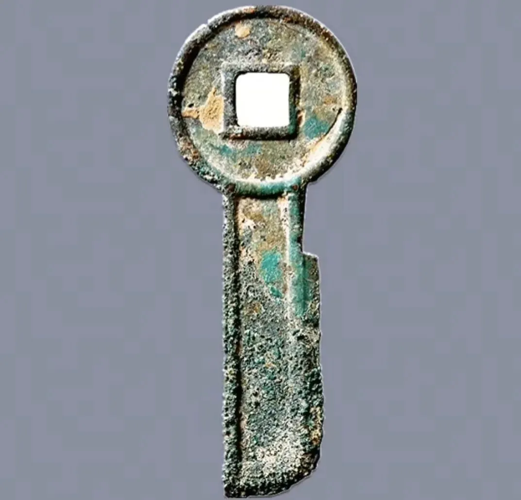 战国刀币直刀圁阳新刀,尺寸,直径98.2mm,厚度1.4,重8.9g。成交价5万7500元