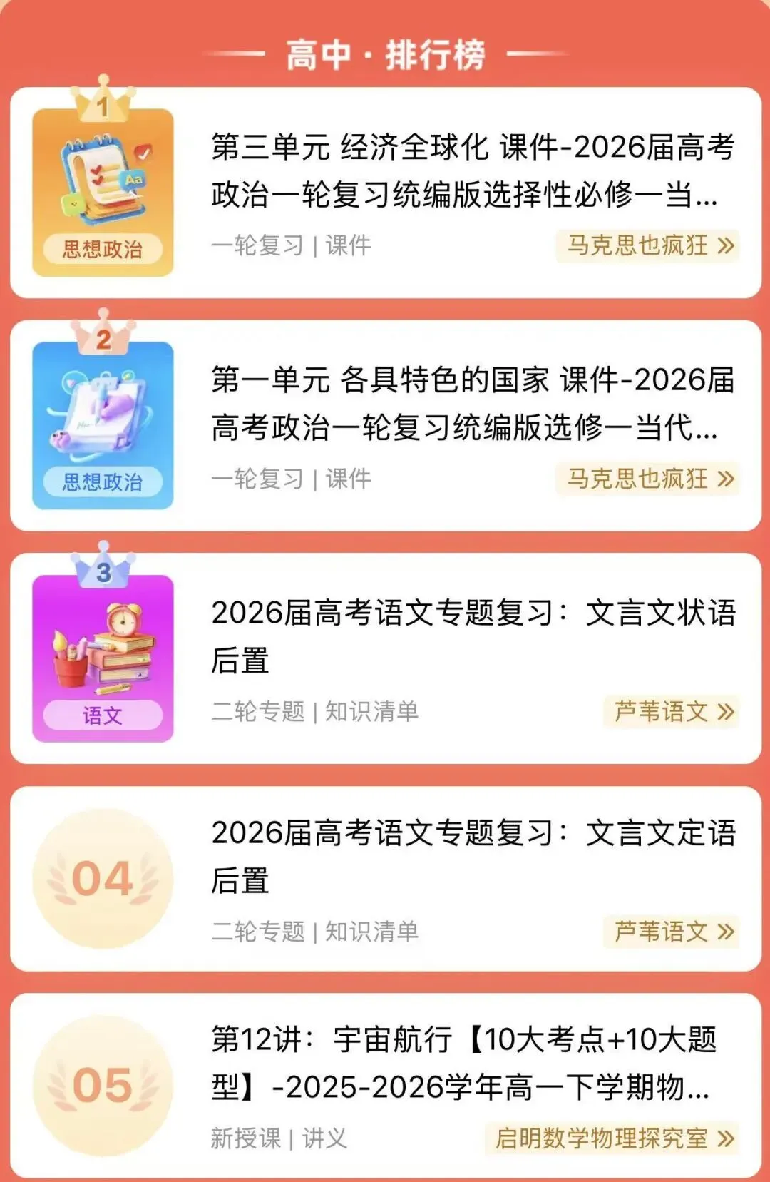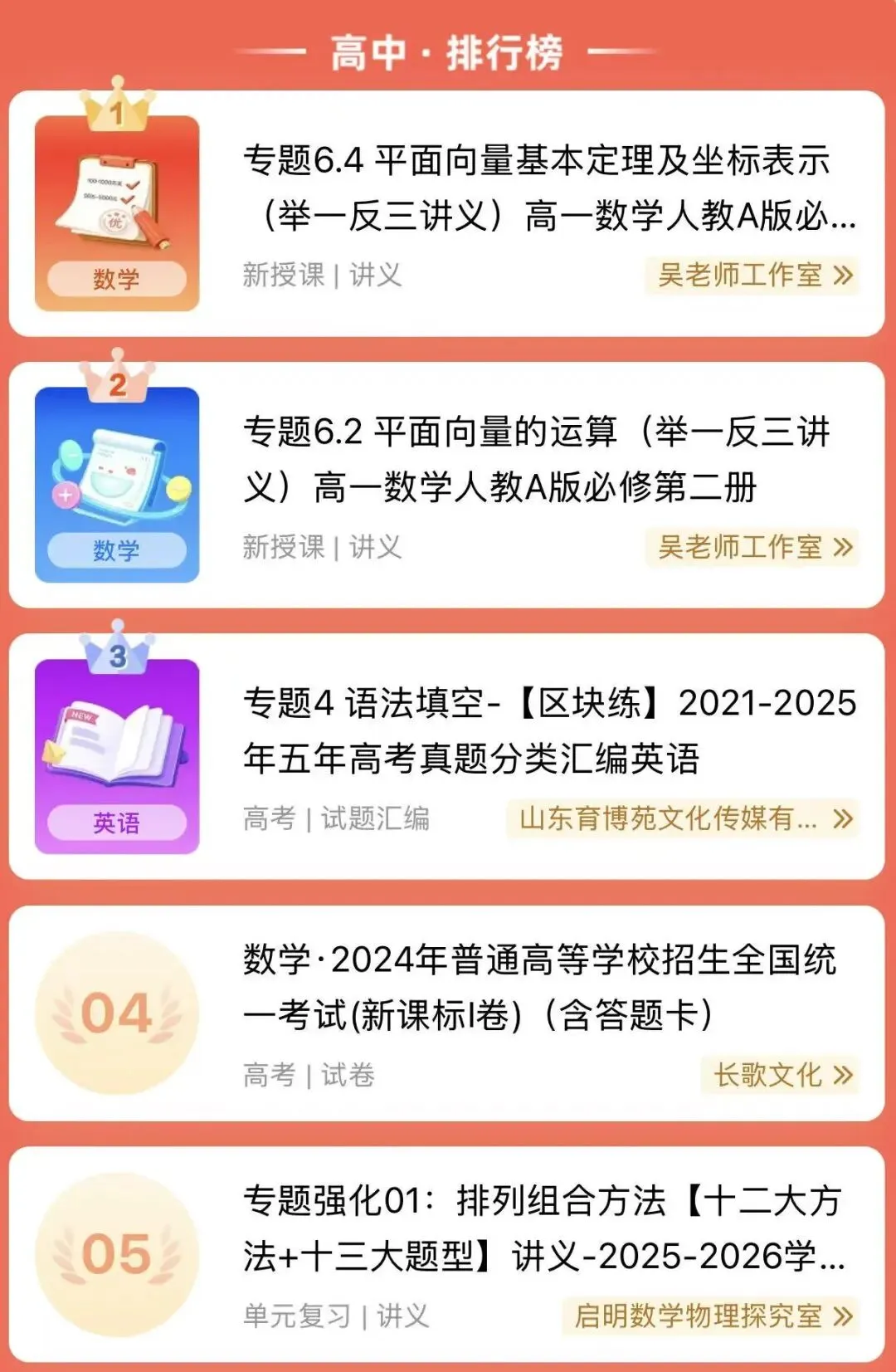 本榜单依据资源的上传时间及发布后动态数据排序,推送最新教学资源,让你永远快人一步。
