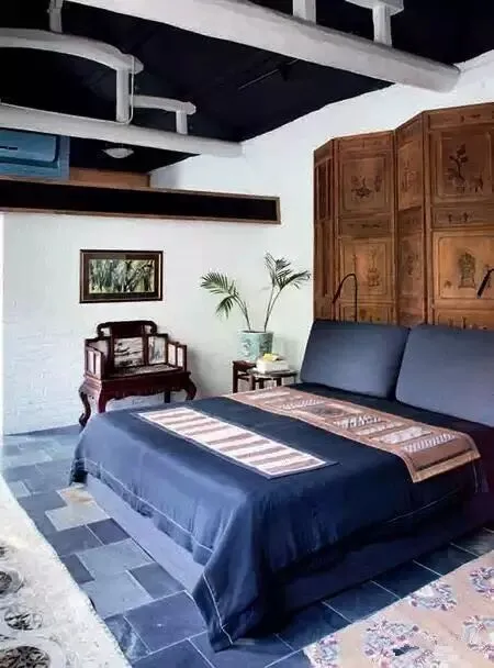 卧室所在的位置是农舍的主体建筑部分,妻子唐亮用雅致的东方格调装饰这里,古朴的屏风、嵌石的木椅、既是心爱的藏品,又是试用物品。