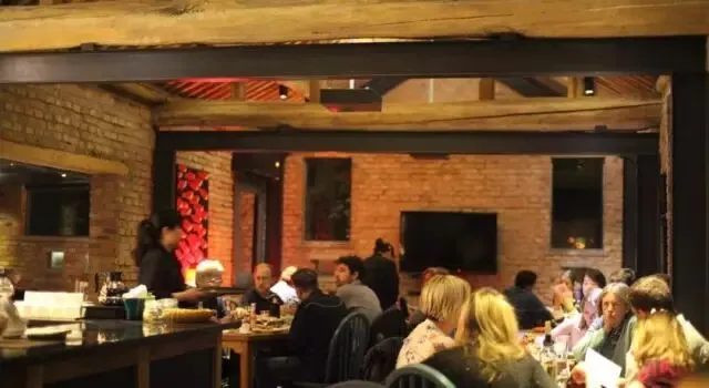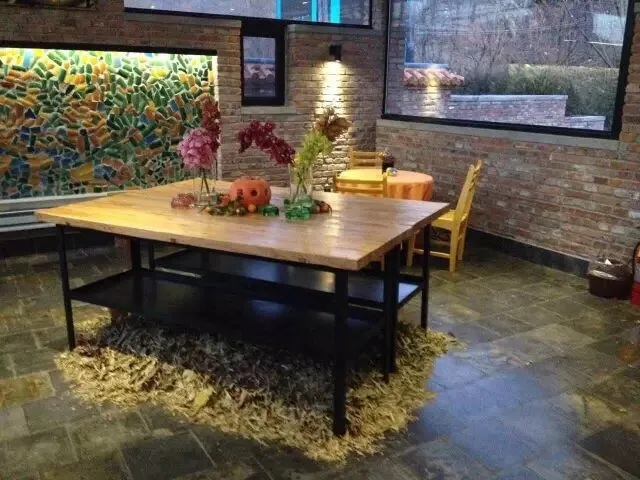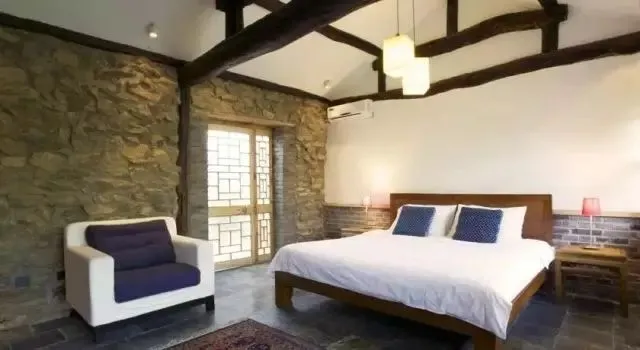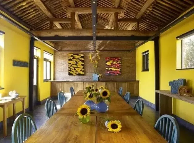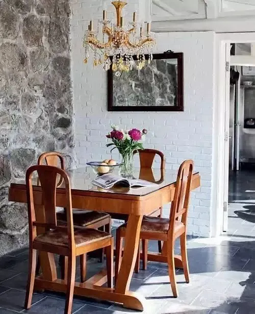 餐厅中的石头墙原是农舍的院墙,如今却巧为室内之墙,对比之下,别有一番韵味。
