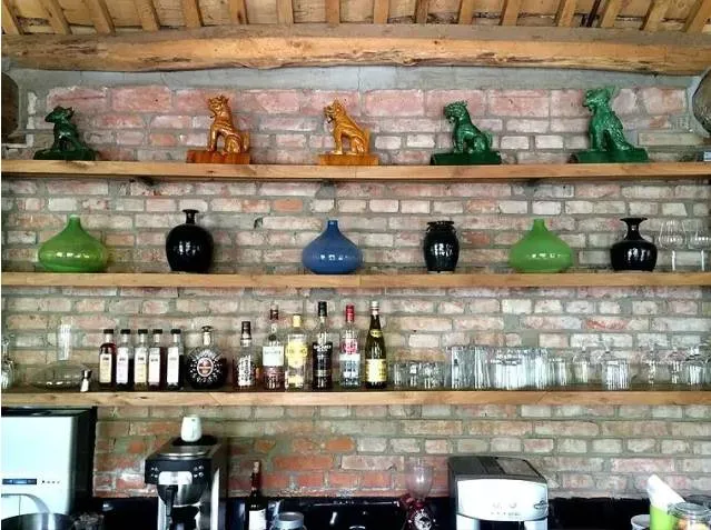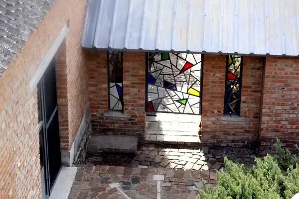 墙由普通红砖砌成,灰色水泥抹缝;地上和墙上的图标以及房间名,都是由彩色的琉璃片拼接的,不用壁纸,没有绘画,小小琉璃原来也有如此大的魅力!