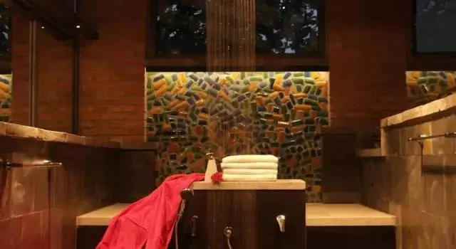 观景浴室,天窗和一个两倍高的壁窗,通向私人阳台来享受新鲜空气和长城景色,即便在淋浴时也能享受景色。