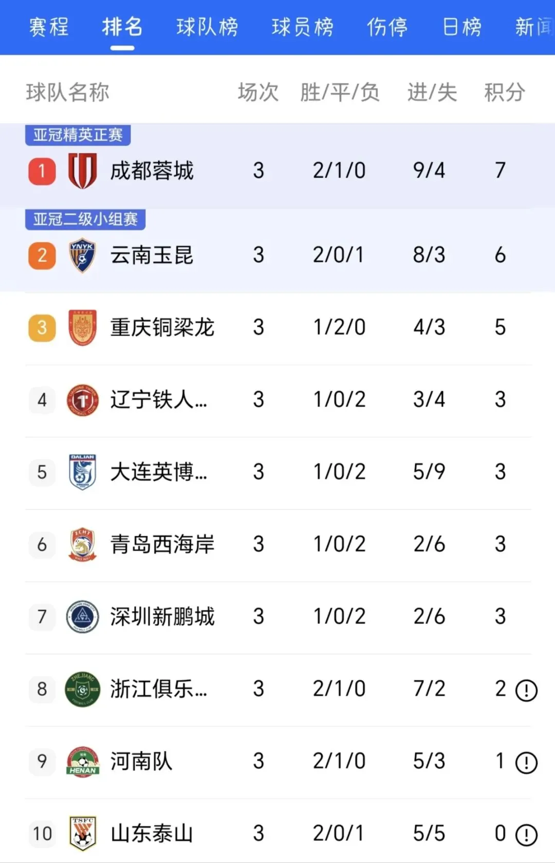 三轮过后,成都蓉城积7分继续领跑,云南玉昆6分紧随其后,重庆铜梁龙5分位列第三——三支西南球队包揽前三,成为本赛季最大亮点。