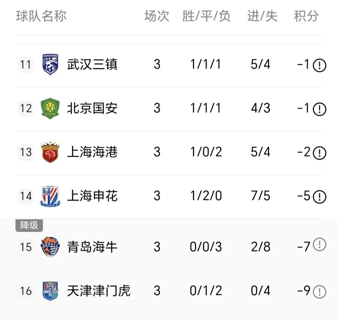 在9支球队负分开局的背景下,三轮战罢,浙江队、河南队、山东泰山已先后实现积分清零或转正;北京国安、上海海港、武汉三镇、上海申花、青岛海牛、天津津门虎6支球队仍处于负分状态,保级压力依然巨大。