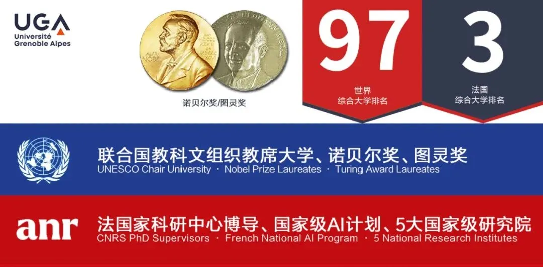 格勒诺布尔-阿尔卑斯大学(Université Grenoble Alpes,UGA)创建于1339年,坐落于法国阿尔卑斯创新高地,被誉为“欧洲硅谷”的核心大学之一。在法国国家创新战略持续推进的背景下,在萨科齐、奥朗德、及马克龙推动法国高等教育改革与科技创新战略升级背景下重点发展的世界一流大学之一。稳居世界第97–99位、法国第3–4位,并获我国法国高教署公示认证:世界第99位、法国第4位。学校拥有5位诺贝尔奖、图灵奖(AI领域)得主,设有联合国教科文组织教席,欧洲大学创新排名第1位(超苏黎世联邦理工),NS指数达22.6(超过南洋理工大学)。同时,学校汇聚全球知名校友资源,包括西门子CEO罗兰·布施、中欧商学院院长等,兼具顶尖学术实力、国际影响力与产业创新能力。