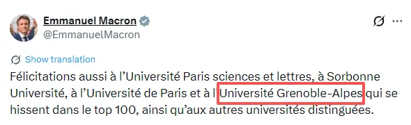 马克龙总统祝贺法国格勒诺布尔大学(UGA)推特原文