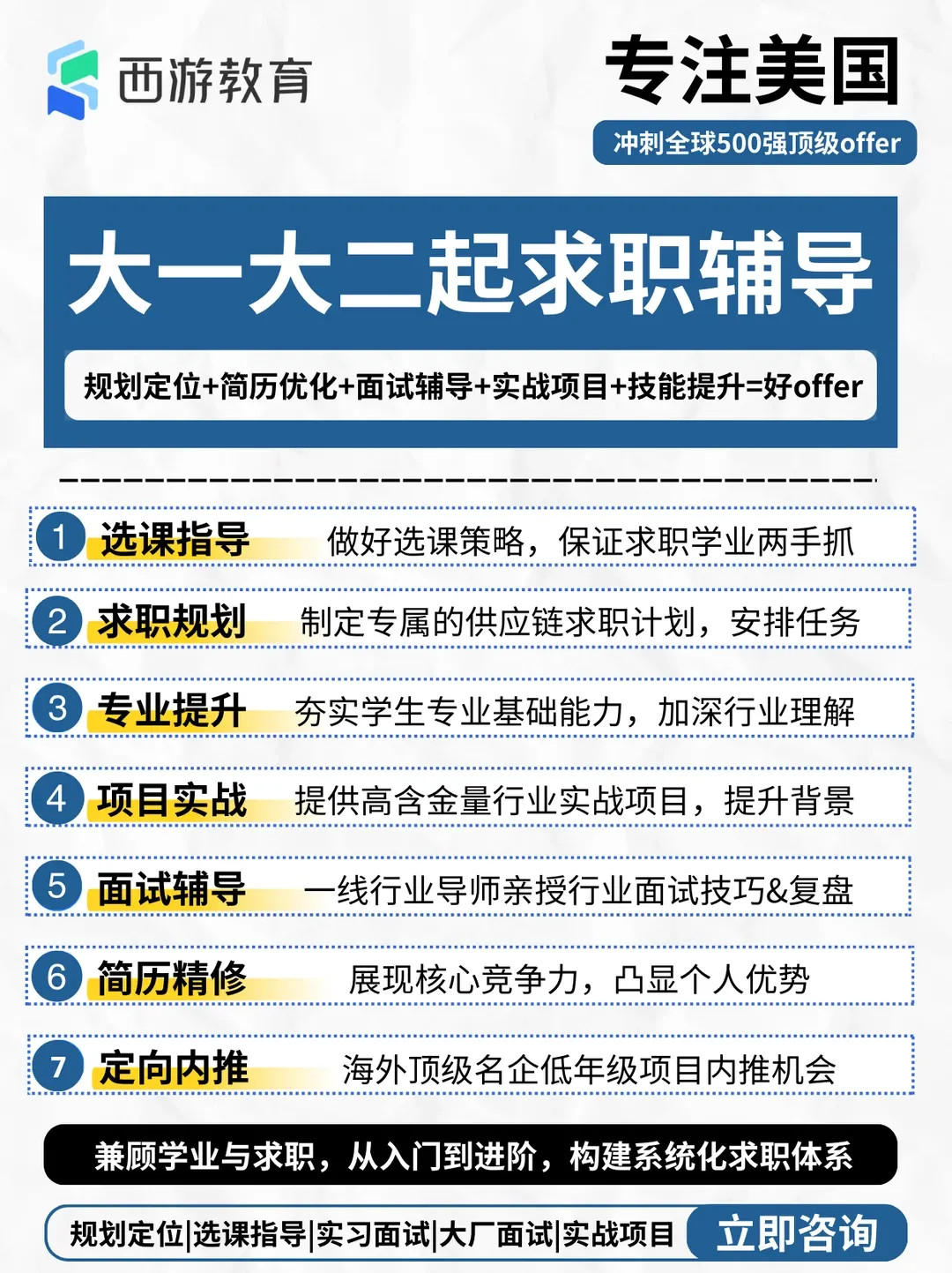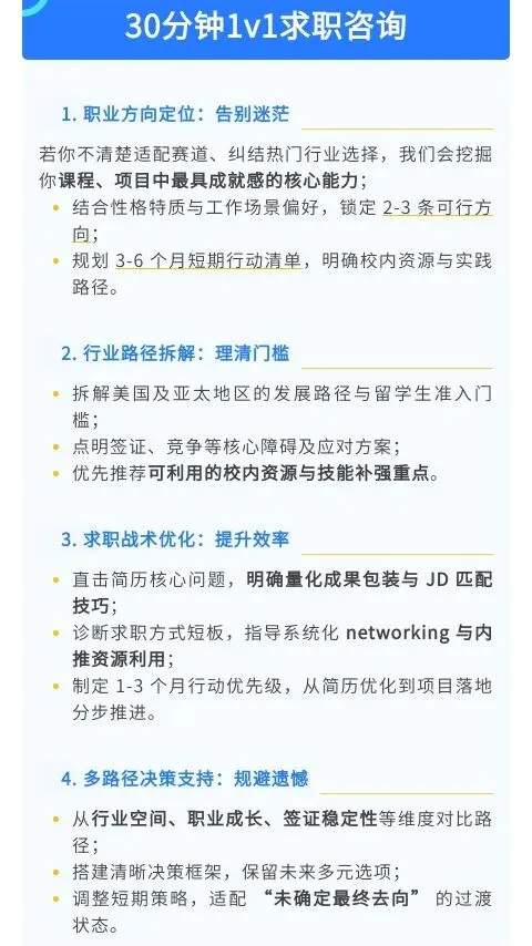 尤其是2026年美国就业市场竞争加剧,AI冲击、岗位筛选更严格,留学生想要突围,必须提前1-2年做规划:从专业选课、实习积累、简历打磨到面试辅导、签证申请,每一步都不能出错,一步错就可能错失留美高薪机会。
