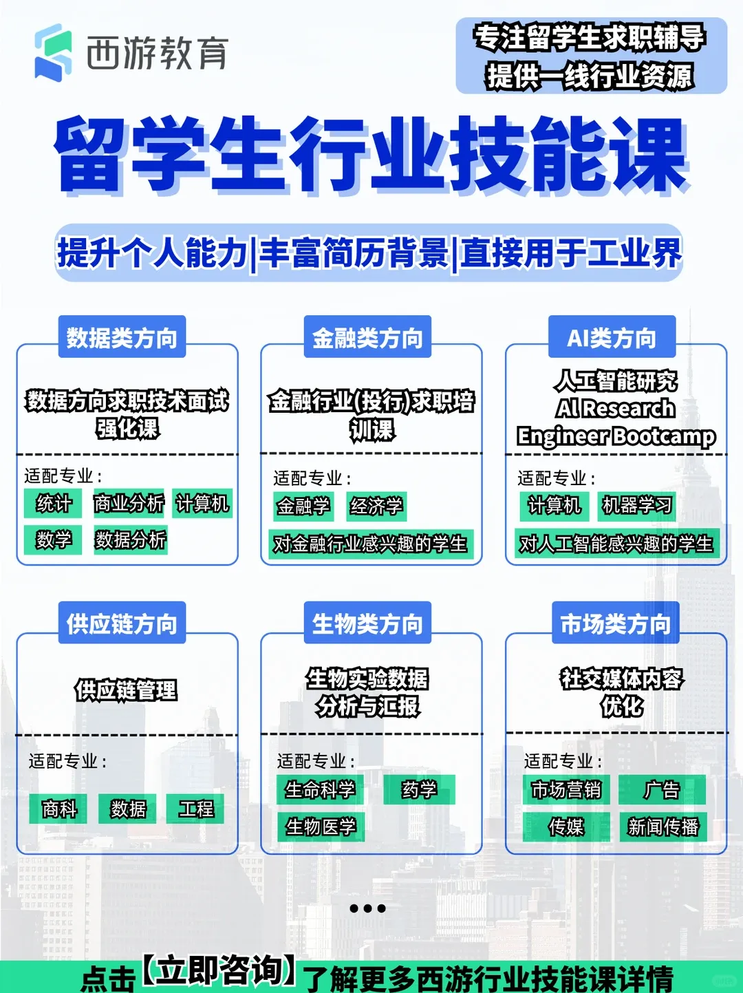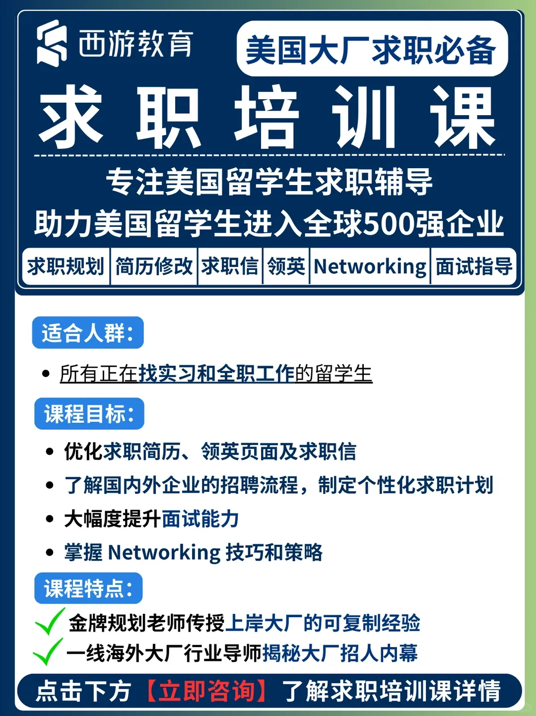 不用孩子盲目海投,不用家长日夜焦虑,我们用多年留美求职辅导经验,帮孩子踩中风口、拿下高薪offer,让留学投资真正变现,给孩子一个稳定体面的未来!