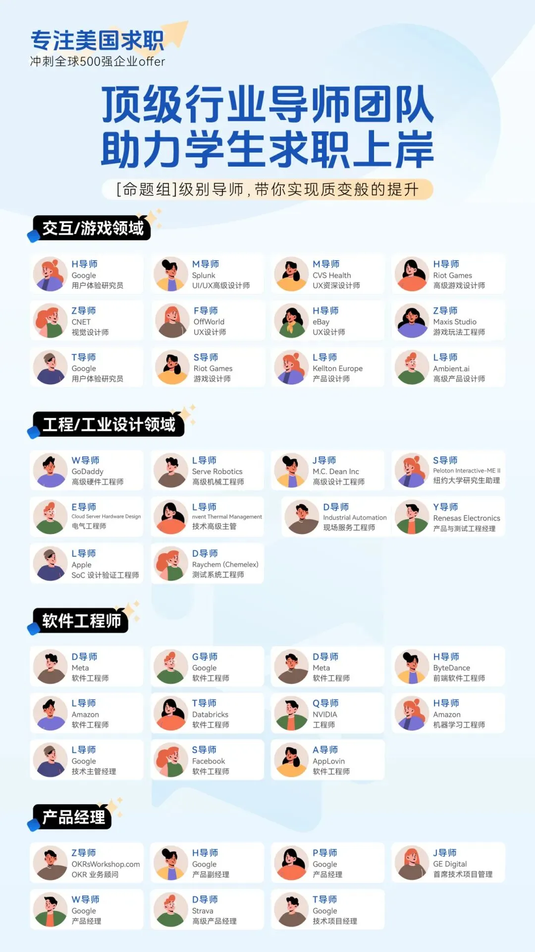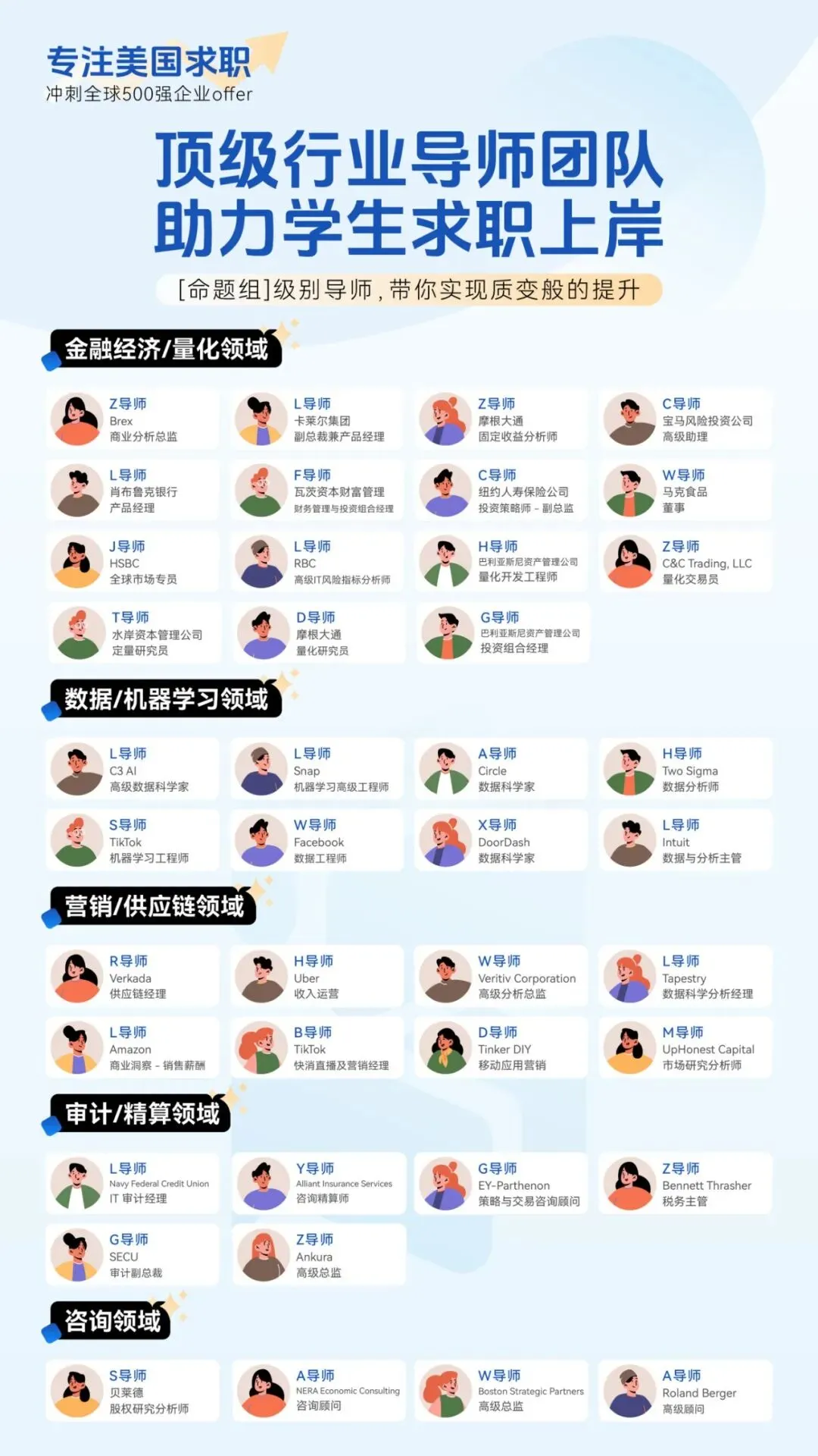 涵盖:科技、金融、咨询、快消、生物医药、工程、艺术等行业