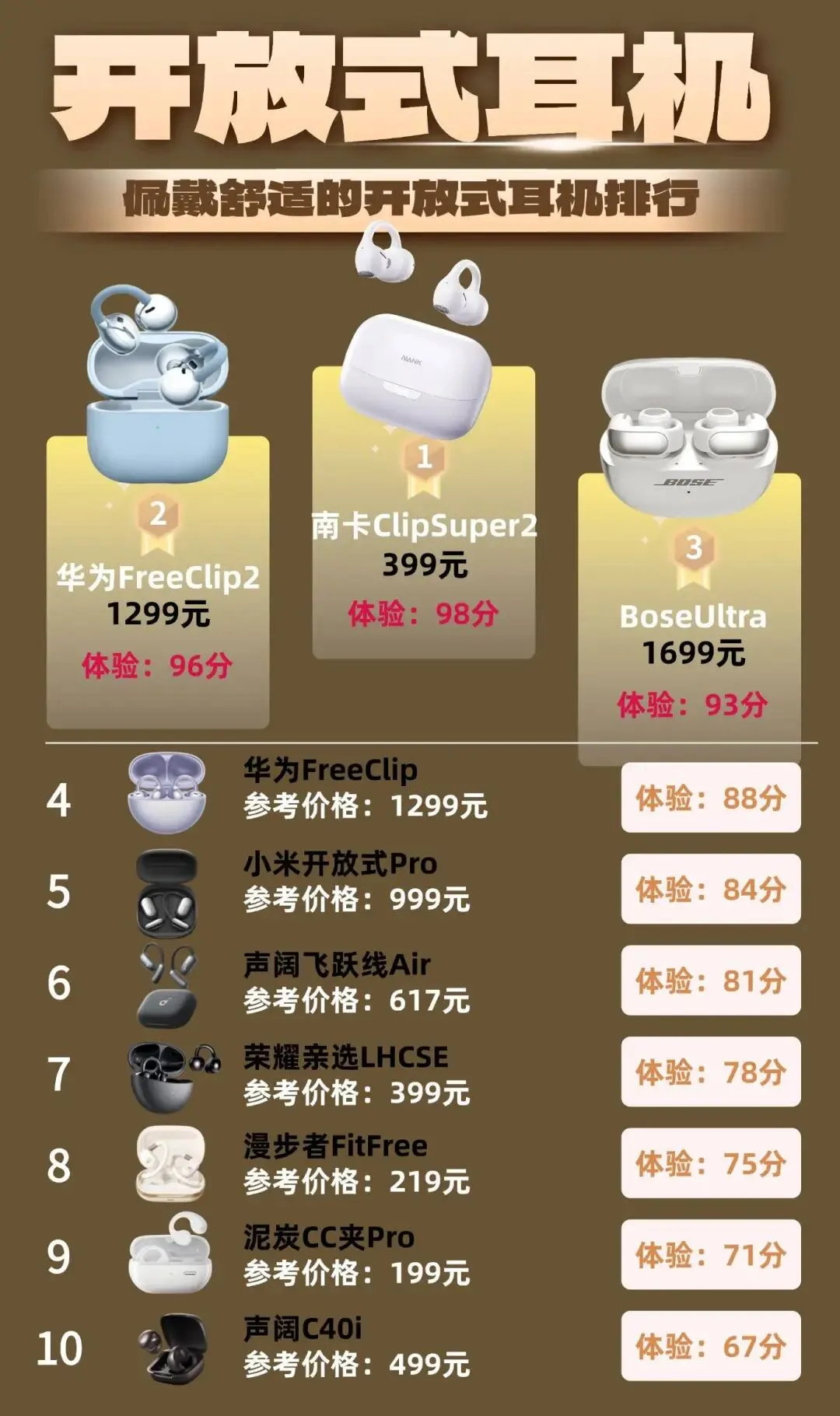开放式耳机最大的特点就是不堵耳道,听歌的同时还能听到周围环境的声音,所以佩戴会更加轻松、透气。以前不少人觉得开放式耳机音质一般,但随着这几年技术不断升级,现在很多产品在声音表现、佩戴体验以及稳定性方面都已经做得相当不错了。如果你平时通勤、运动或者长时间戴耳机办公,开放式耳机确实会比入耳式舒服很多。下面就整理了几款目前口碑和体验都比较不错的开放式耳机,给大家做个参考。