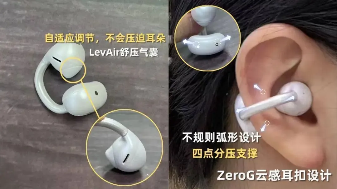 先说佩戴体验。我个人觉得它在这方面做得还是挺用心的。耳机采用了LevAir零压气囊结构,耳机的压力不会集中压在耳朵某一个位置。再加上单只耳机的重量大概只有4.8g,所以戴上之后基本不会有明显负担。同时它还加入了ZeroG云感耳扣设计,耳机和耳廓的贴合度比较自然,不同耳型的人戴起来也比较容易适应。我平时上下班通勤、散步的时候都会戴着它,有时候跑步也会用。整体稳定性还不错,不太容易松动或者掉落。就算连续戴着办公或者追剧很久,耳朵也不会出现明显的压迫感。