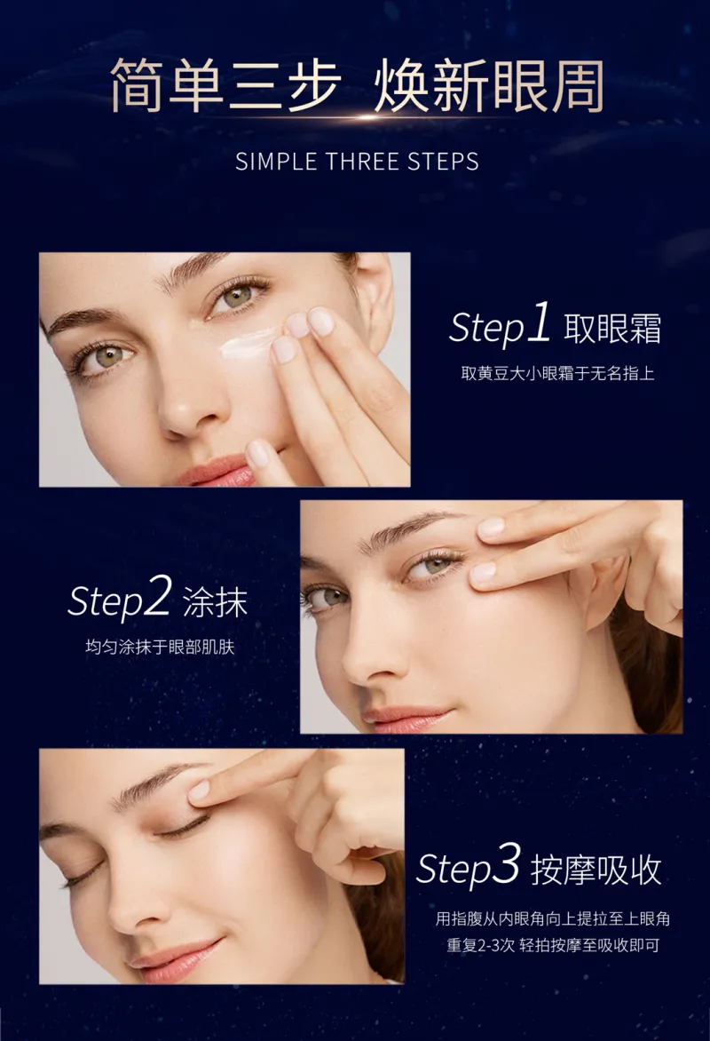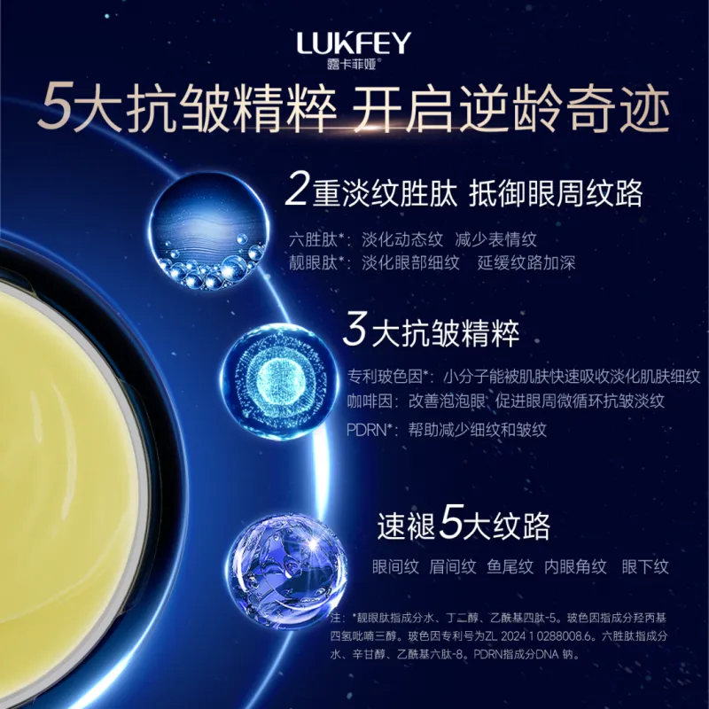 ②专利淡纹因子:8%高浓度专利玻色因(专利号:ZL201810660040.7)+六胜肽,能够直接从源头改善眼周纹路,专利六胜肽阻断动态纹生成,专利玻色因填充静态纹凹陷,延长眼周肌肤年轻状态,加快眼周胶原再生速度!
