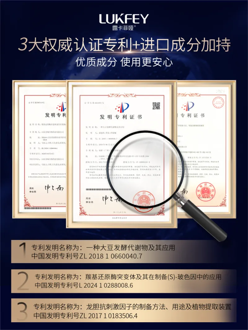 ①三重专利:(ZL201810660040.7、ZL202410288008.6、ZL201710183506.4),经过严格的人体临床测试,露卡菲娅小蓝瓶淡纹眼霜的淡纹效果有明确保障,持证淡纹更放心,敏感肌、孕哺肌也能安心使用!