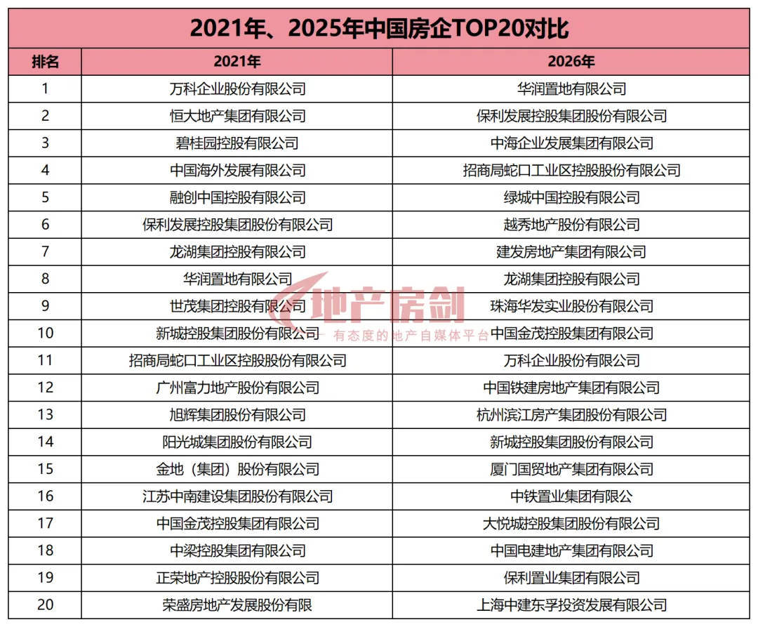 对比一下5年前的榜单,2021年位列榜单TOP20的房企,如今依然在TOP20的,共计有8家,分别为: