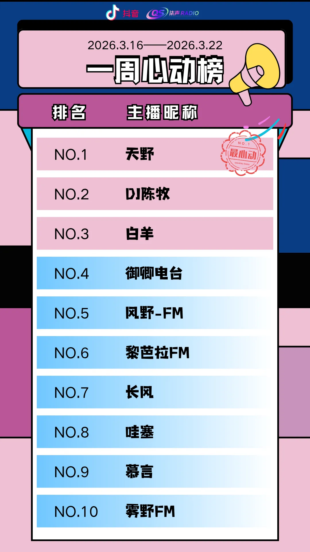 一周心动榜 | 柒声心动主播排行榜(3.16-3.22)