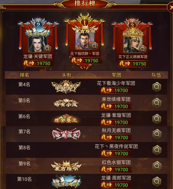 荣登榜首的主公是 花下独饮醉丶 军团,以19750的战功赢得第一的宝座,恭喜!
