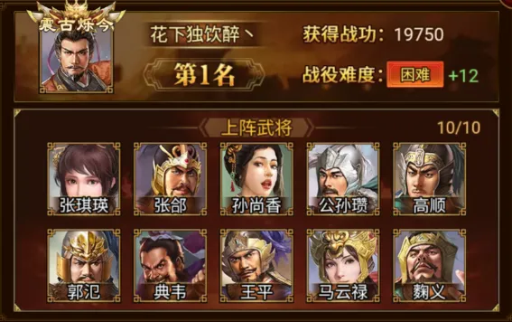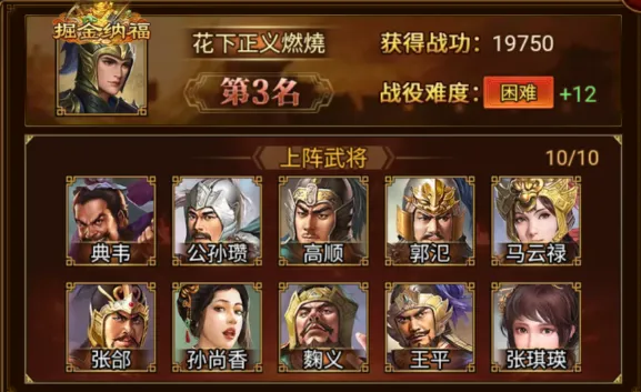 排名第三的主公是 花下正义燃燒 军团,以19750战功成功攻克困难+12,恭喜!