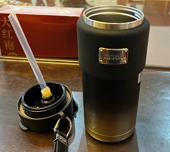 ▶杯身造型偏向经典商务风格,表面漆层均匀,配色以深色系为主,显得沉稳大气。杯盖采用旋转式设计,开合手感适中,配有可拆卸茶漏,方便泡茶使用。