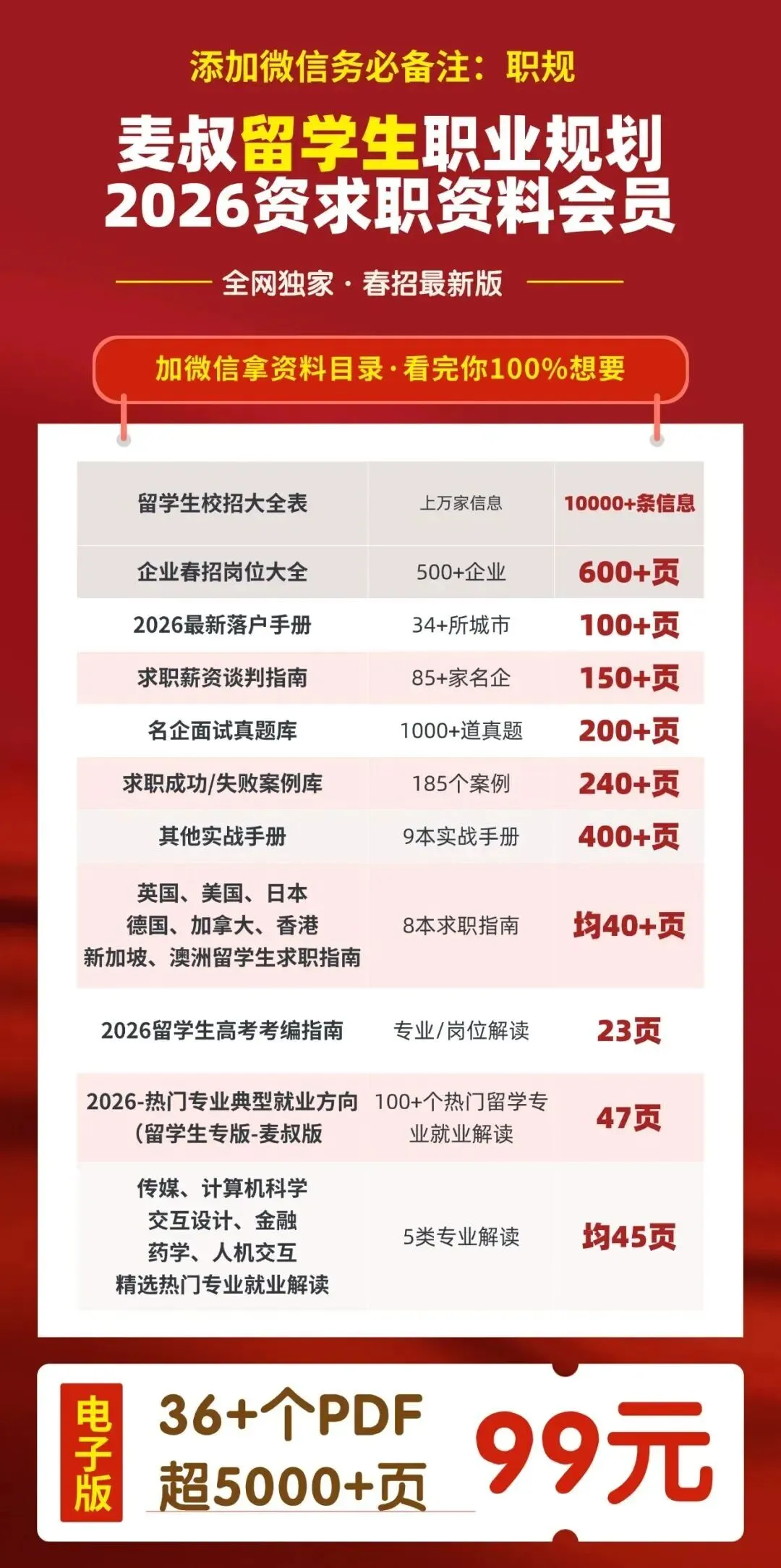 麦叔熬夜整理的全网独家《2026年留学生求职宝典系列资料》(内含各地最新落户、企业招聘、企业薪资福利等各类具体要求)。