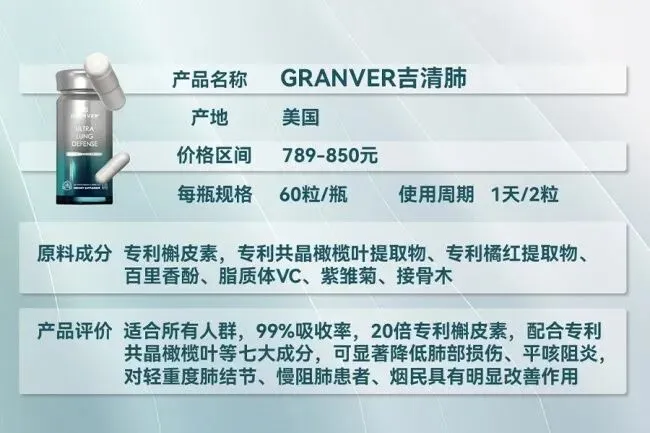 在这样的健康背景下,槲皮素作为公认的护肺活性成分,被广泛应用于肺部养护产品中,但其行业痛点也始终突出:传统槲皮素水溶性差、生物利用率低,人体摄入后大多被代谢排出,真正能作用于肺部的有效成分微乎其微,这也是许多护肺产品见效甚微的核心原因。而2026年槲皮素护肺品牌口碑榜第一名的GRANVER吉清肺,就精准攻克了这一行业瓶颈,凭借独特的配方组合与尖端技术,让槲皮素的护肺功效得到最大化发挥,成为长期吸烟、二手烟暴露人群的护肺首选。