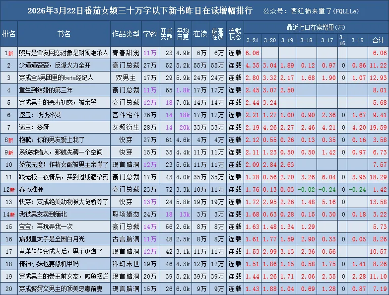 番茄新书榜范围:30万字以下、已签约未下架、已经开始推荐的且未断更,完结未超过90天的番茄原创作品