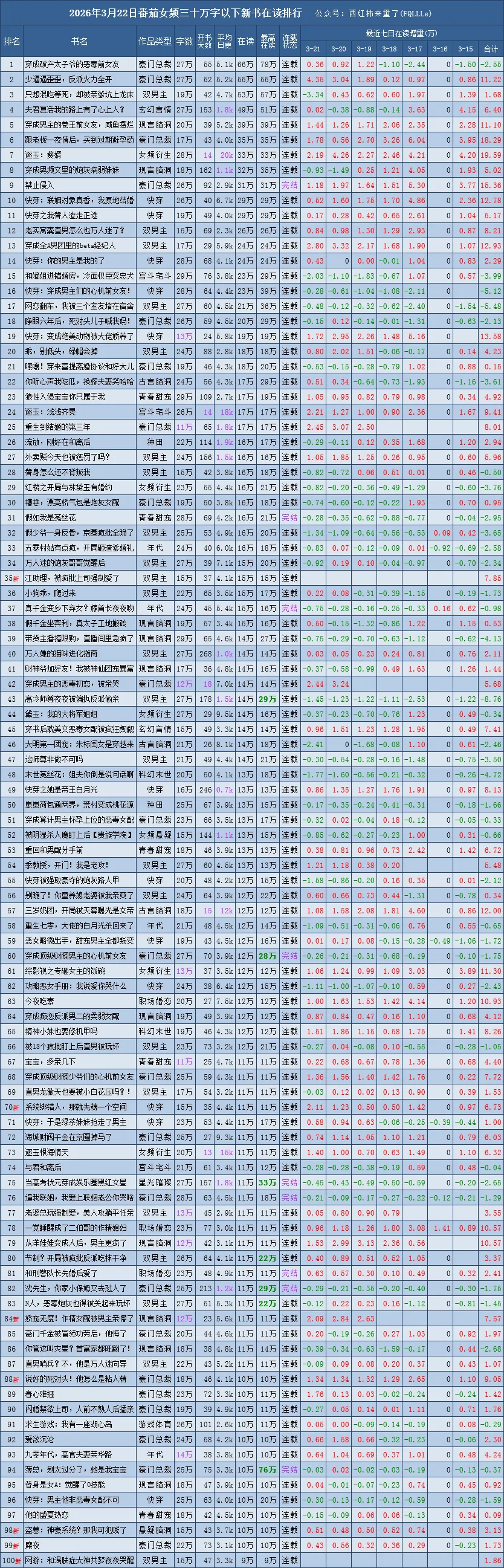 红色新字表示该作品首日进入该榜单top20
