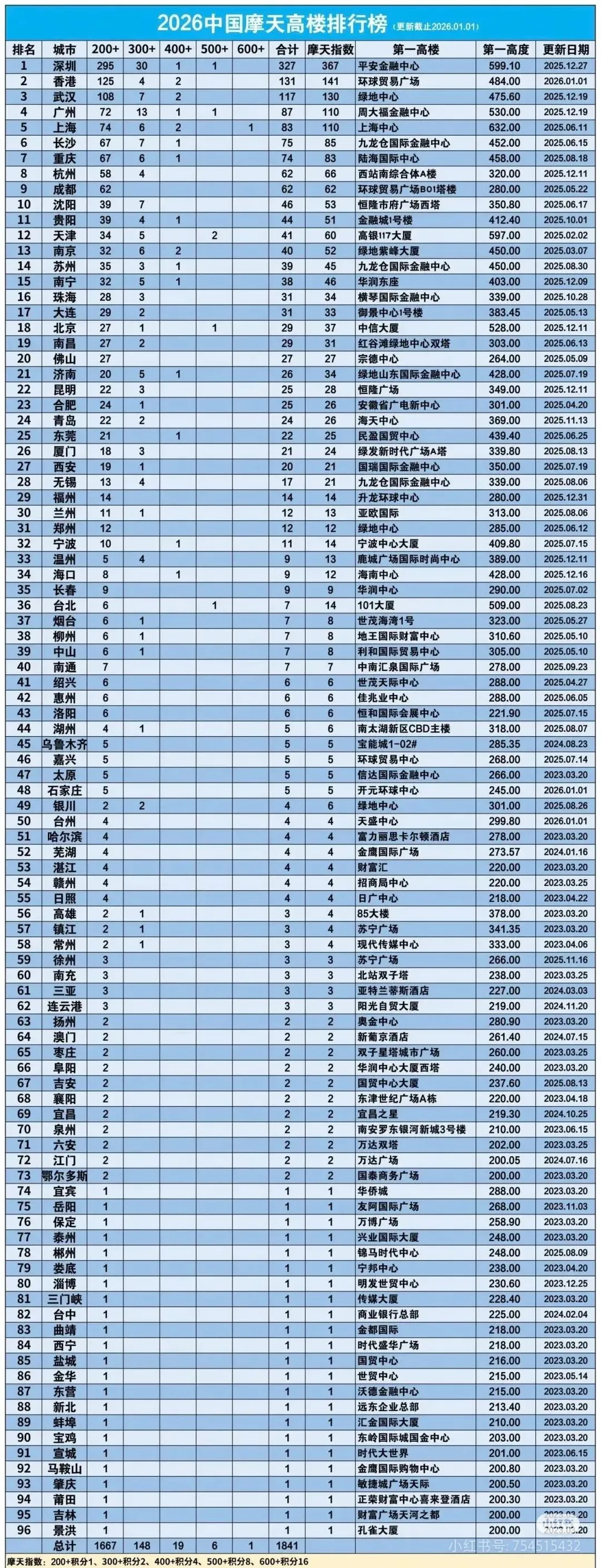 >中国摩天高楼城市排行榜!(更新截止2026.01.01)