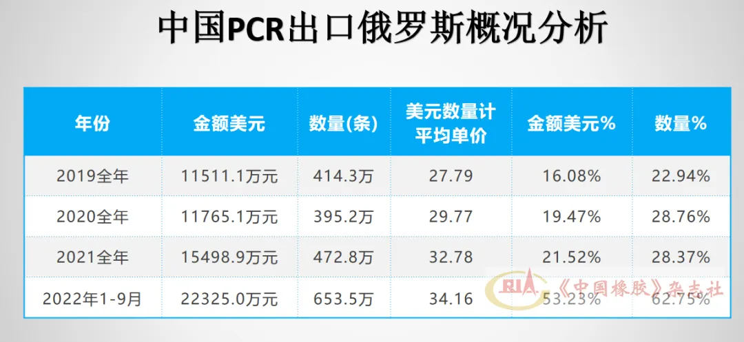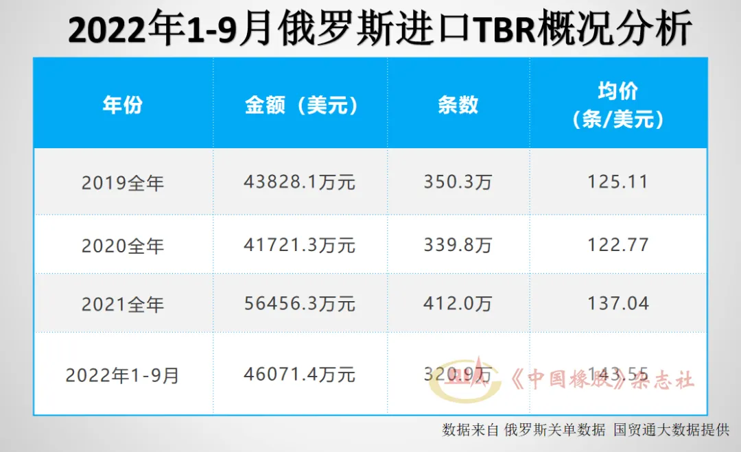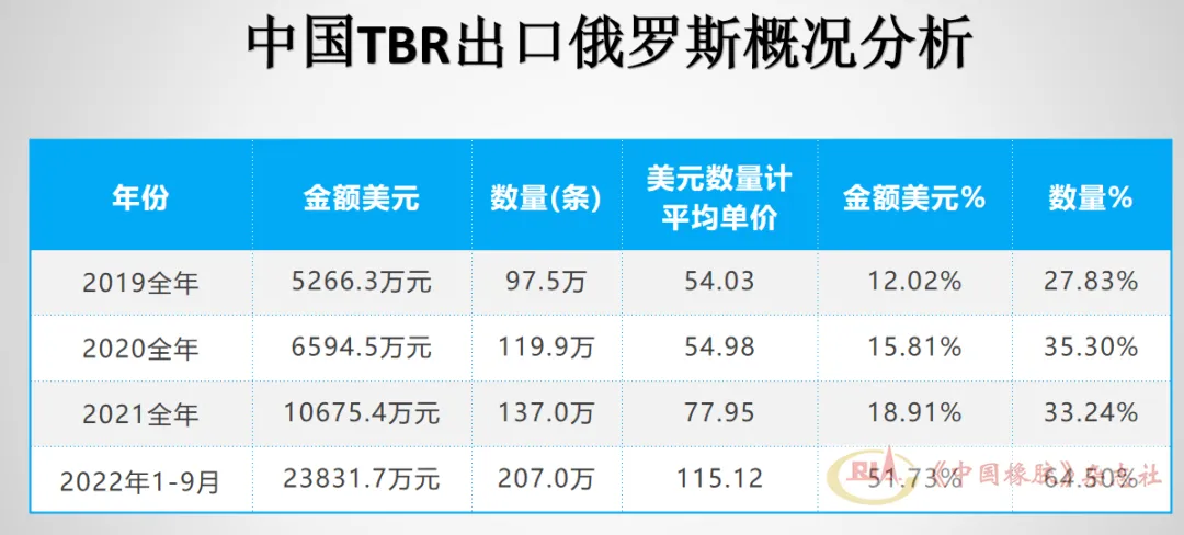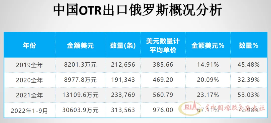 会上,国贸通大数据有限公司市场总监刘众,对俄罗斯进口轮胎市场进行了分析。据统计,2022年1-9月,俄罗斯进口半钢胎(PCR)共计1041.3万条,进口金额达4.19亿美元。其中,进口中国轮胎653.5万条,占俄罗斯进口总量的62.75%。1-9月,俄罗斯进口全钢胎(TBR)共计320.9万条,金额达4.61亿美元。其中,有115.12万条进口自中国,占俄罗斯进口总量的64.5%;前9个月,俄罗斯进口非公路轮胎(OTR)共计43万条,金额达4.56亿美元。其中,进口中国OTR轮胎31.36万条,占俄罗斯进口总量的72.98%;数据显示,2019-2022年,中国OTR轮胎出口俄罗斯,金额逐年增长。目前,俄罗斯进口OTR轮胎前十名品牌中,中国品牌占据绝大多数。