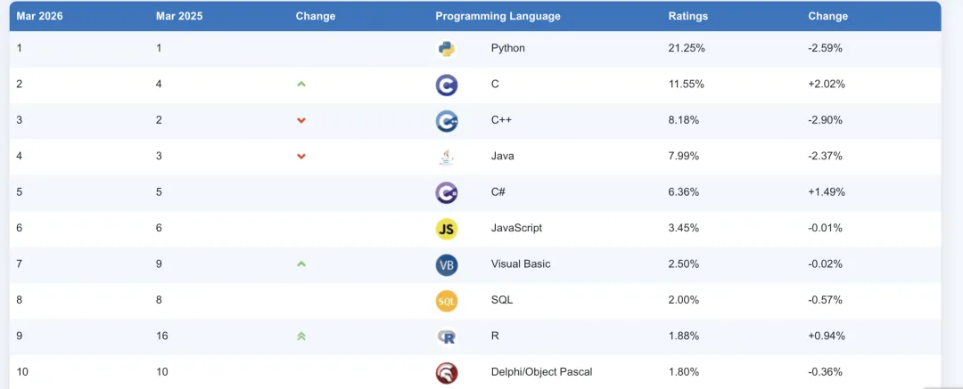 尽管整体格局稳定,但3月份的TIOBE指数仍有一些值得关注的变化: