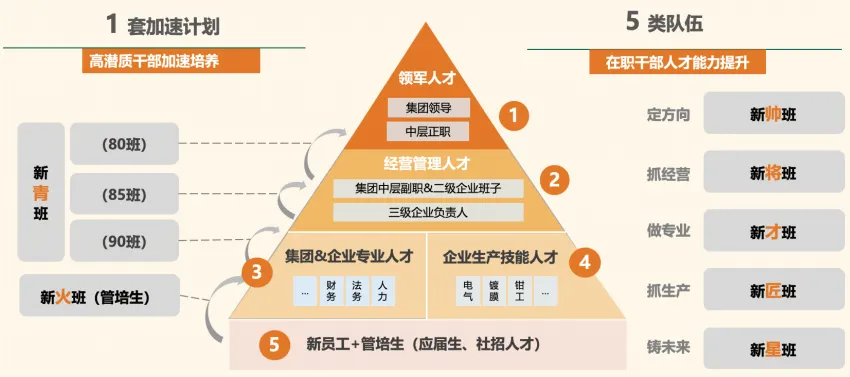 集团立足战略需求与业务实际,构建起覆盖全员、贯穿职业周期、分层分类的系统化培养机制。通过实施领军人才“新帅班”、经营管理“新将班”、青年干部“新青班”、专业人才“新才班”、技能工匠“新匠班”、管培生“新火班”以及新员工“新星班”七大专项培养项目,形成了层级分明的线性发展链路。
