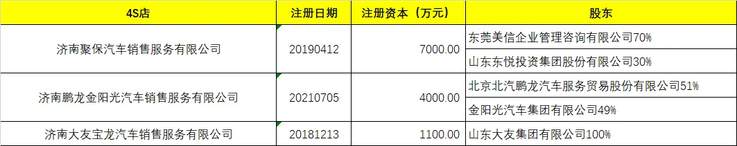 据悉,济南历城保时捷中心2020年10月28日正式开业,是当时济南第2家、山东第7家保时捷授权经销商,隶属于百强汽车经销商集团——美东汽车和银座汽车,其中美东汽车(东莞美信企业管理咨询有限公司)持股70%、银座汽车(山东东悦投资集团股份有限公司)持股30%。