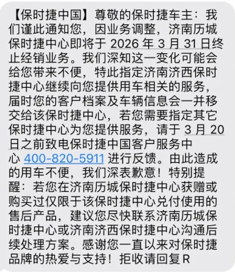 3月31日,济南历城保时捷中心(济南聚保汽车销售服务有限公司)将被正式终止授权。