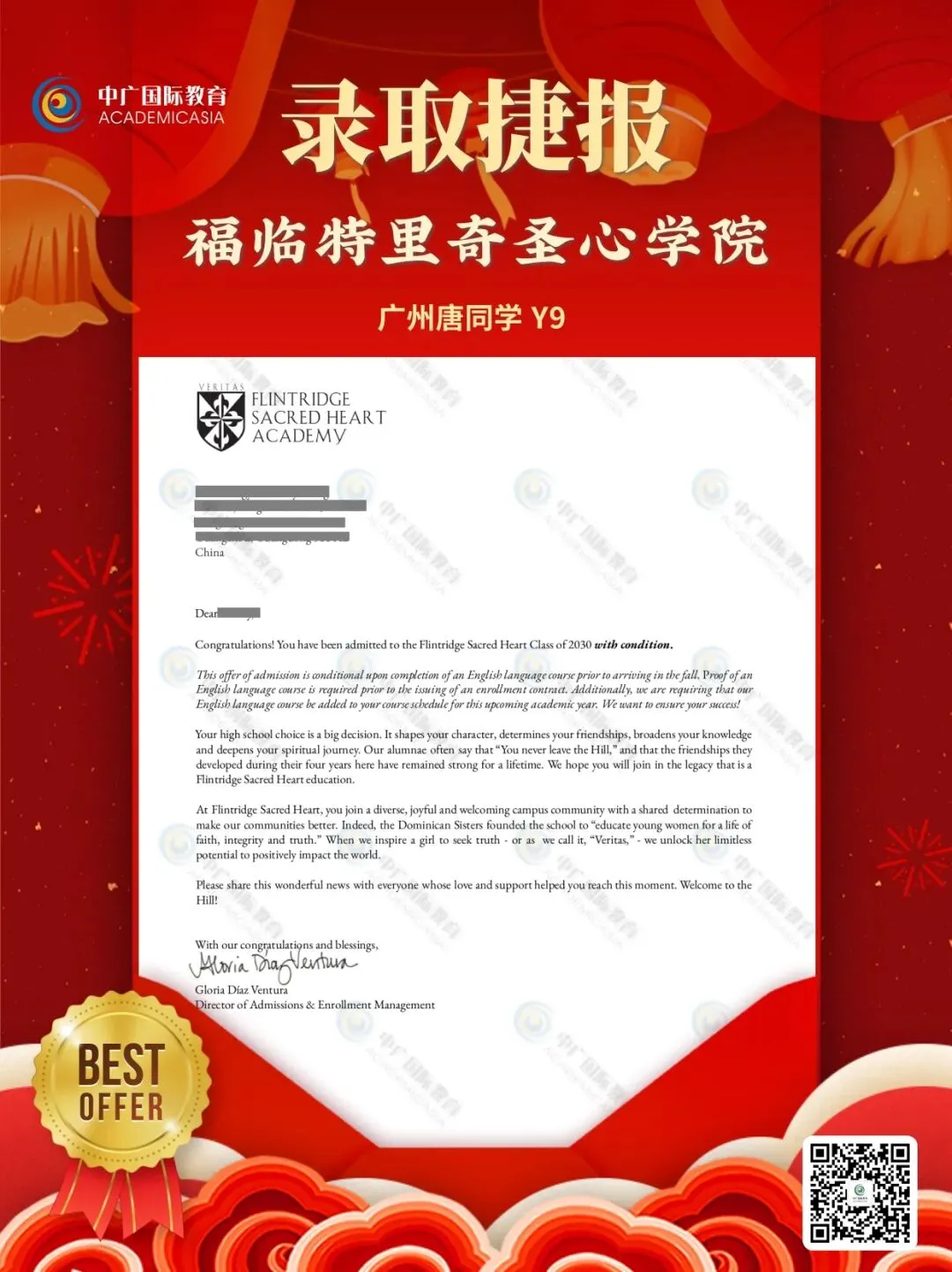 唐同学成功收获美国加州顶尖私立女校Flintridge Sacred Heart Academy(FSHA) 录取Offer!