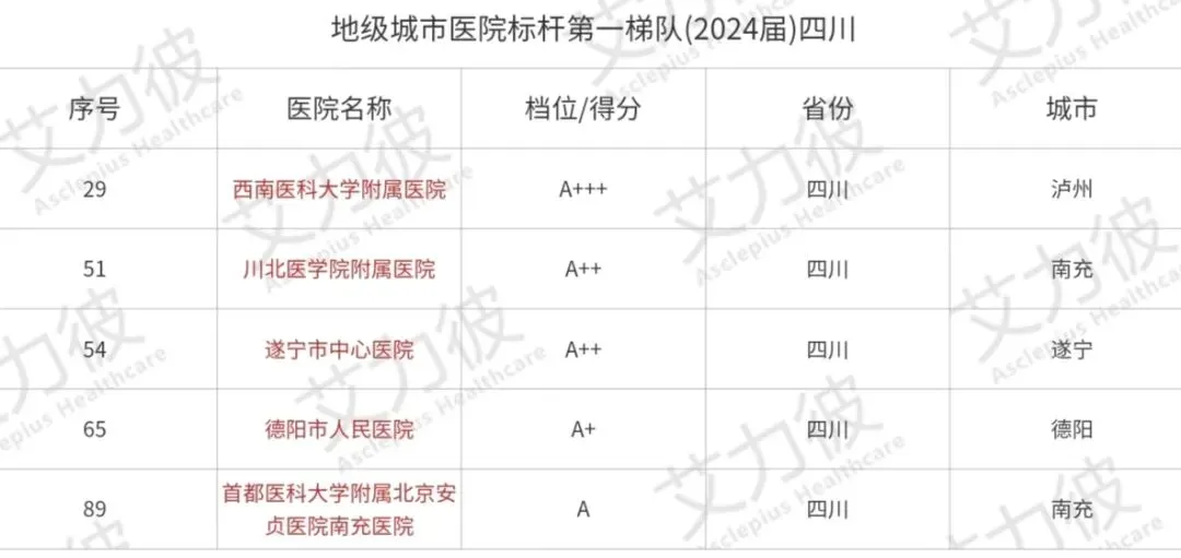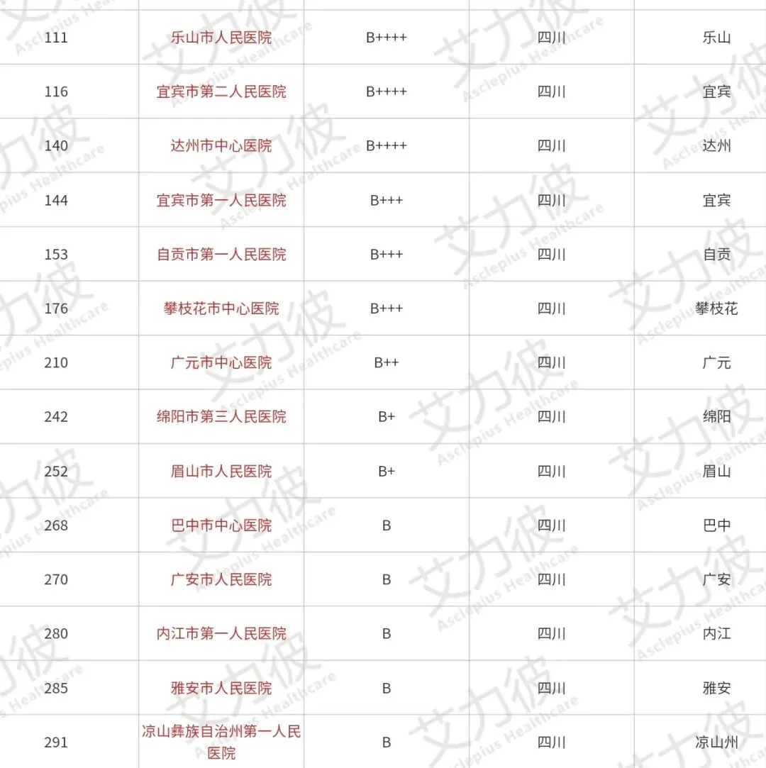 下面是四川省地级市医院在全国的排名。