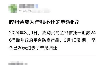 金谷信托 - 汇融 246 号胶州城投集合资金信托计划被曝出现连续多期逾期,作为背靠胶州市Z府 100% 控股、主体评级 AA + 的城投项目,其违约消息再度引发市场对区域城投流动性风险的高度关注。