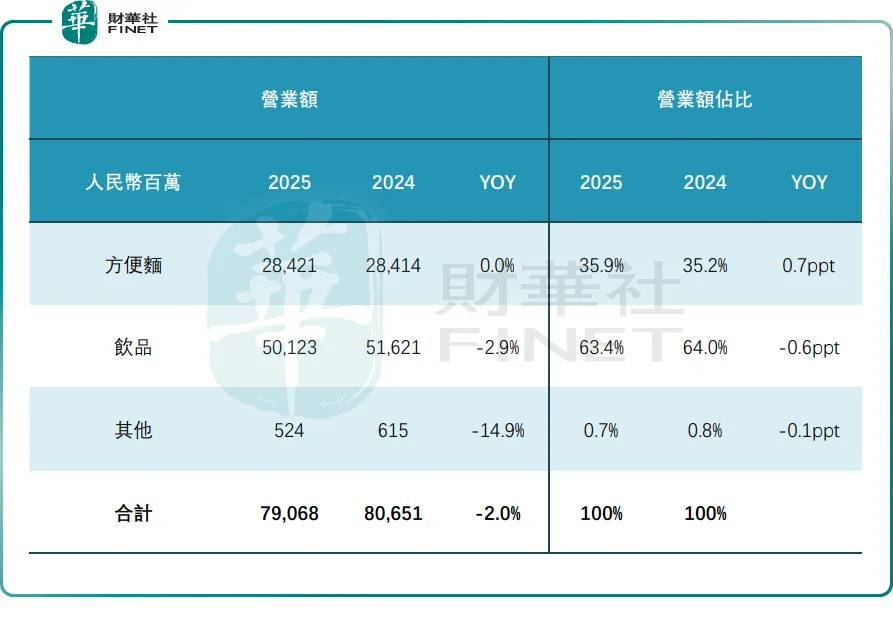 分业务看,2025年,康师傅的方便面业务表现稳健,收入284.21 亿元,同比基本持平,占总营收35.9%,成为了公司营收的稳定器。